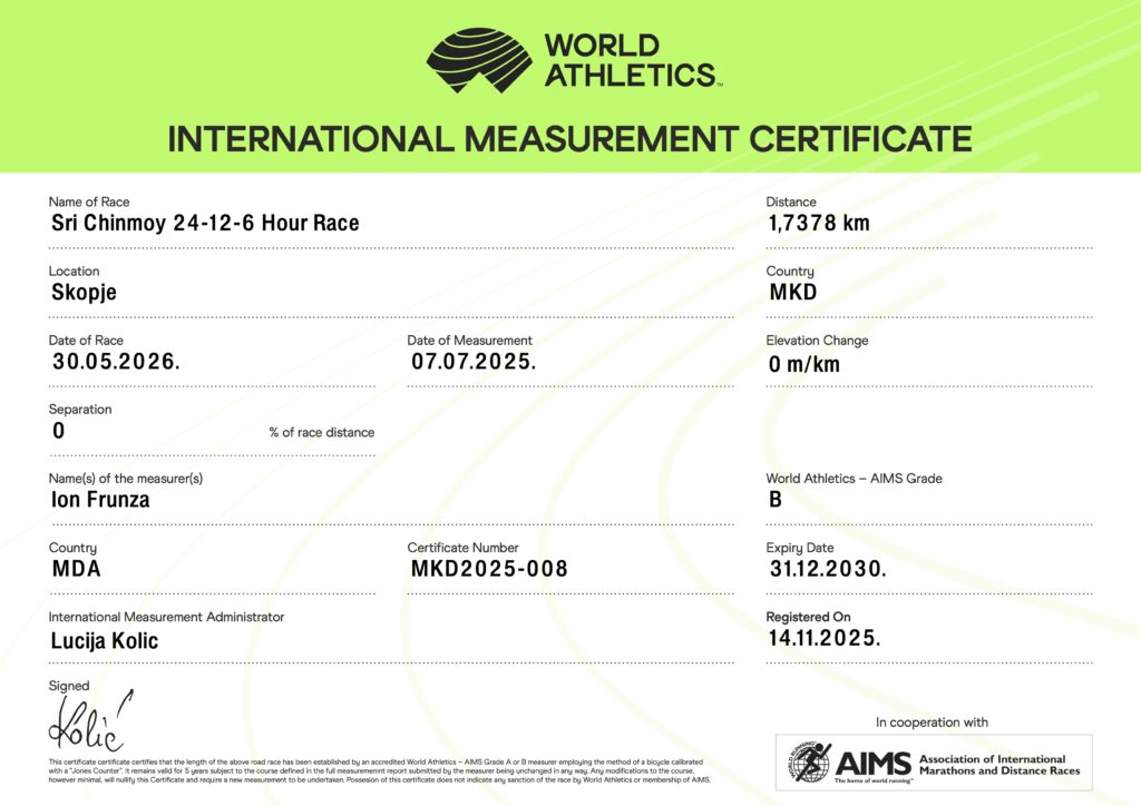 Тhe course has been measured and verified by a World Athletics – AIMS accredited Grade B measurer.