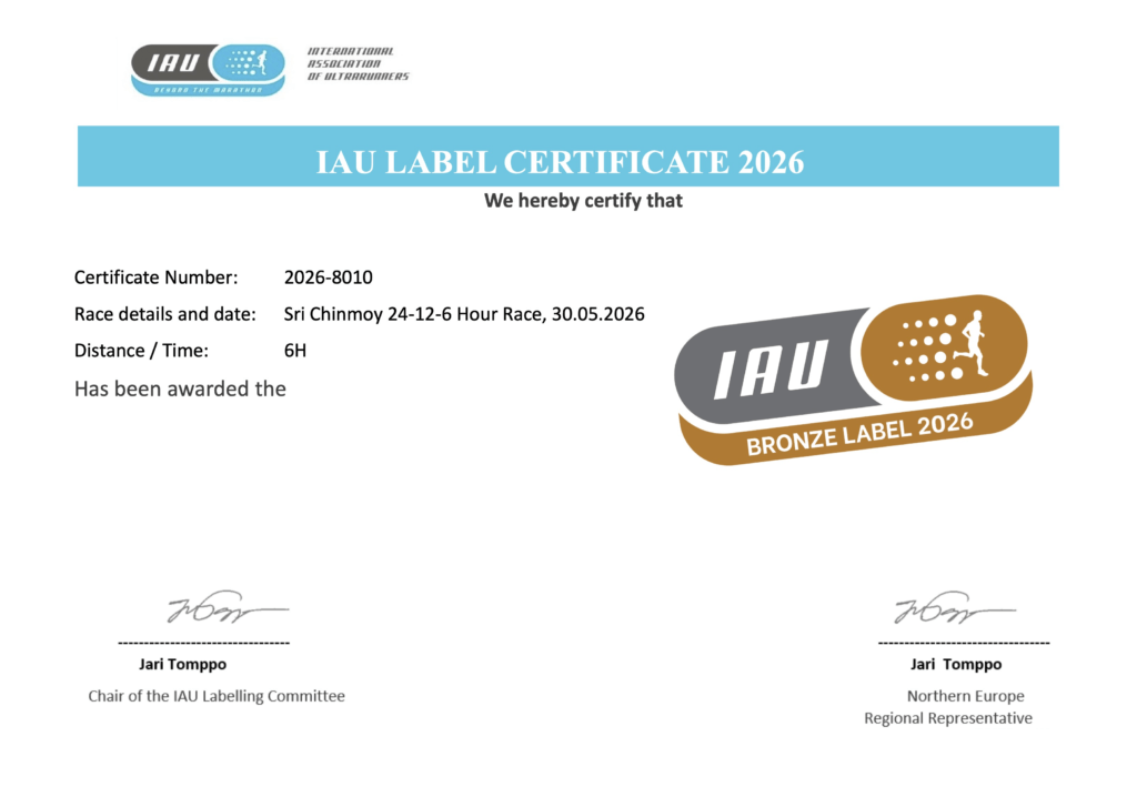 Шри Чинмој 24-12-6 часовната трка 2026 има бронзена ознака од Меѓународната асоцијација на ултратркачи (IAU). Според тоа, сите резултати постигнати на настанот, на трите трки (24-часовната, 12-часовната и 6-часовната трка), се меѓународно признати. Резултатите може да се користат за рангирање, избор на тимови и ратификација на рекорди според правилата на Меѓународната асоцијација на ултратркачи (IAU) и Светската атлетика.